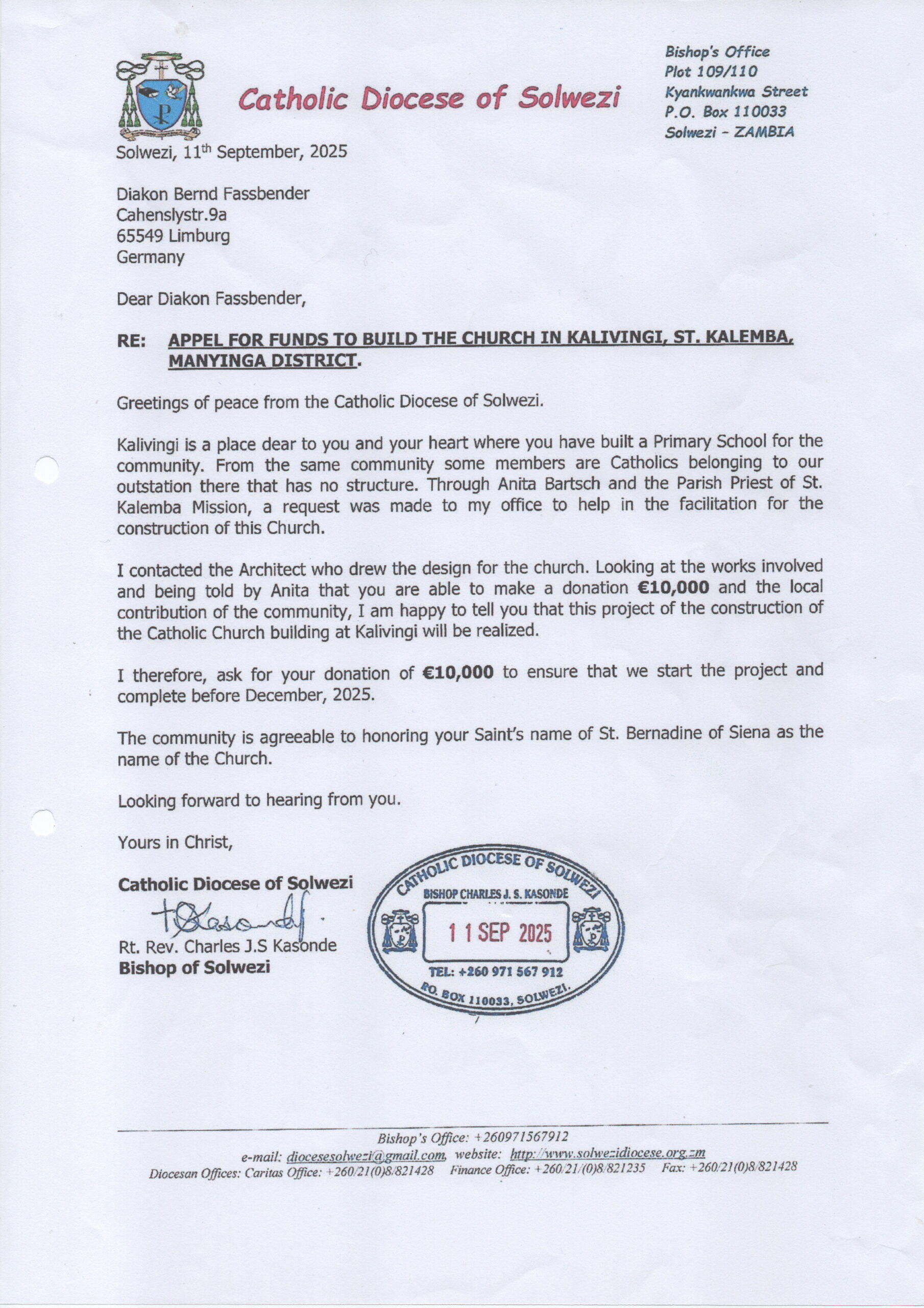 Diakon Bernd Faßbender hat mit dem Bischof von Solwezi Charles J. S. Kasonde vereinbart, dass er, für die ca. 100. Katholiken in Kalivingi eine Kirche bauen darf.