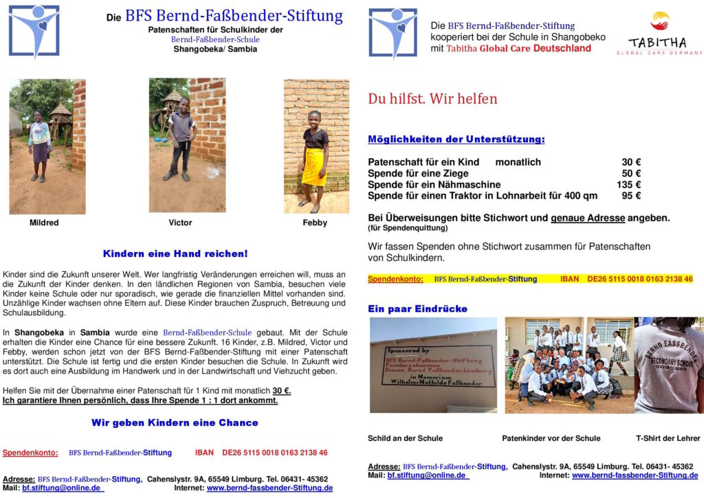 - Die BFS Bernd-Faßbender-Stiftung sorgt für den großen Teil der Gebäudefinanzierung. Die Schule heißt Bernd-Faßbender-School und wurde am 4. April 2024 von Diakon Bernd Faßbender eingeweiht.